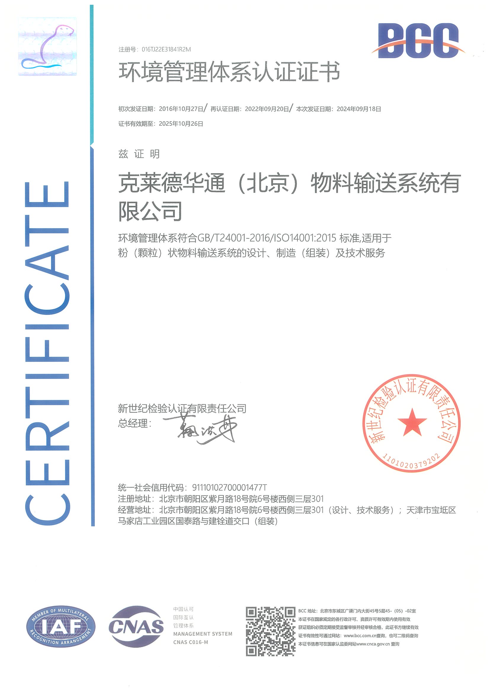 环境管理体系认证证书
