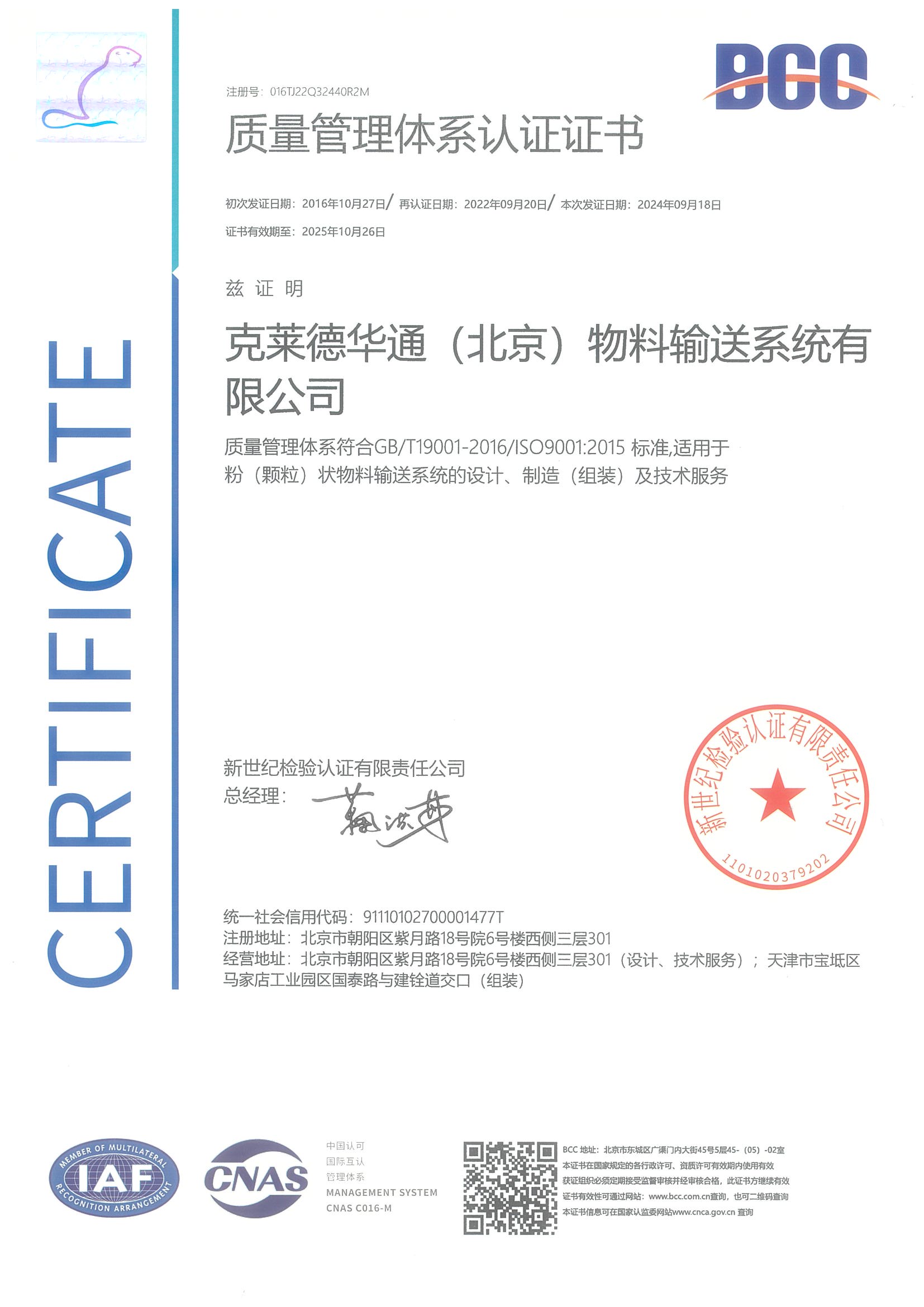 质量管理体系认证证书
